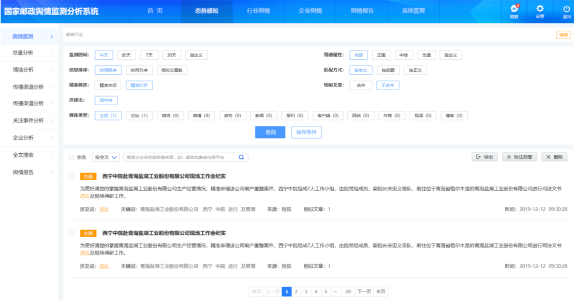 同时系统帮助邮政系统实时监测负面舆论。