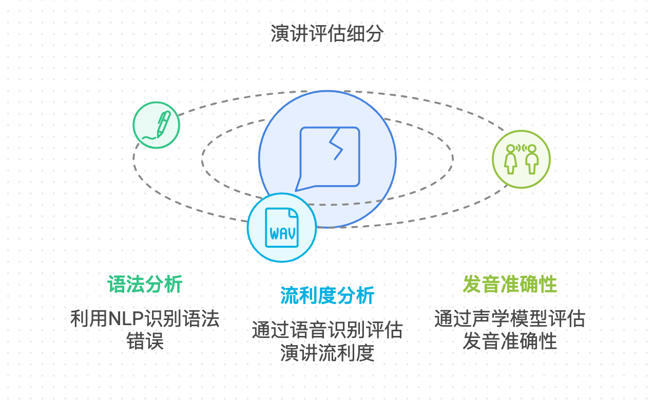 技术实现:基于语音识别技术,将演讲内容转录为文本,通过语速、停顿次数、停顿时长等参数分析流利度。