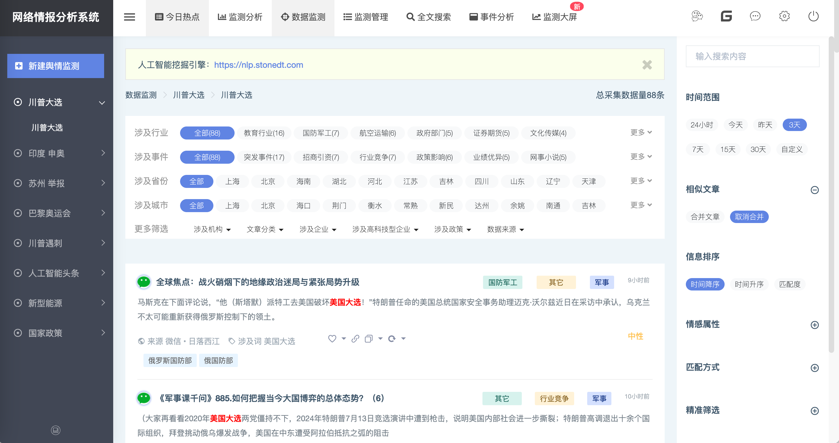思通数科的舆情系统是一个基于大数据分析和人工智能技术的智能化监控与分析平台,旨在实时监测、分析和挖掘互联网上的各类信息、热点事件和舆情动态,帮助政府、企业和机构及时了解网络舆情,洞察市场动态,作出科学决策。该系统集成了深度学习、自然语言处理(NLP)和大数据分析技术,能够从海量信息中自动识别出热点事件,并提供多维度的数据分析报告。