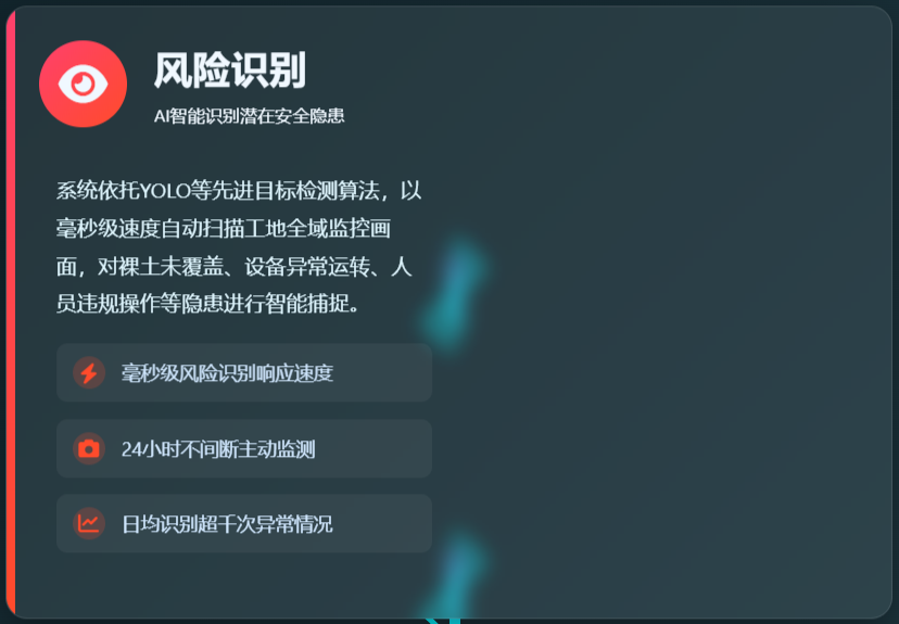 集成YOLO等先进算法,利用预训练模型快速定位风险,基于工地实时数据持续迭代优化,使识别精度超95%。