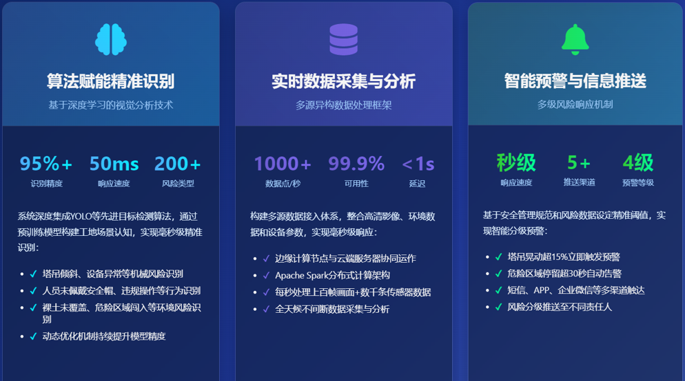 依管理规范和历史数据设风险阈值,如塔吊晃动超限、人员滞留危险区等即触发预警;通过多渠道触达,并按风险分级推送给对应人员,确保预警及时准确。