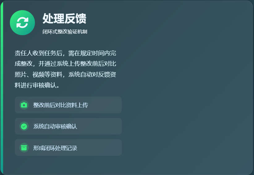 处理反馈:责任人上传整改照片、视频等资料,完成任务闭环