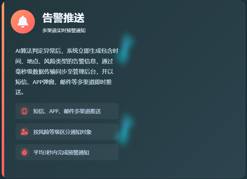 告警推送:系统生成告警信息,同步至管理后台并通知相关人员