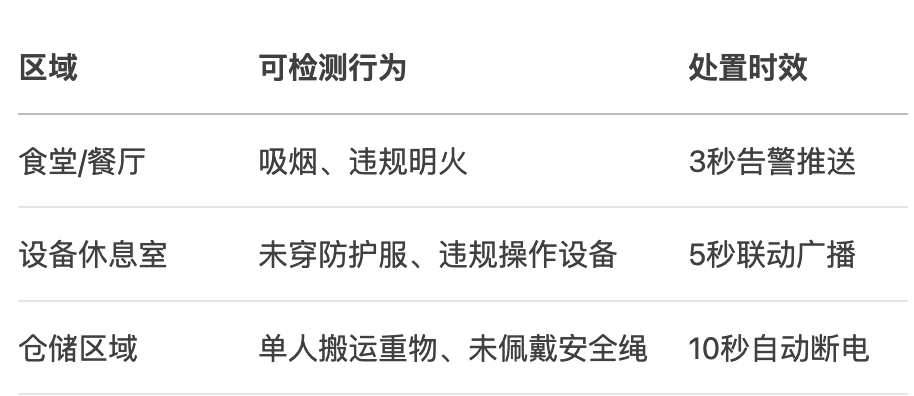 3. 行为解析:通过50万+违规动作样本训练的算法,识别吸烟、未戴防护用具等20类高危行为
