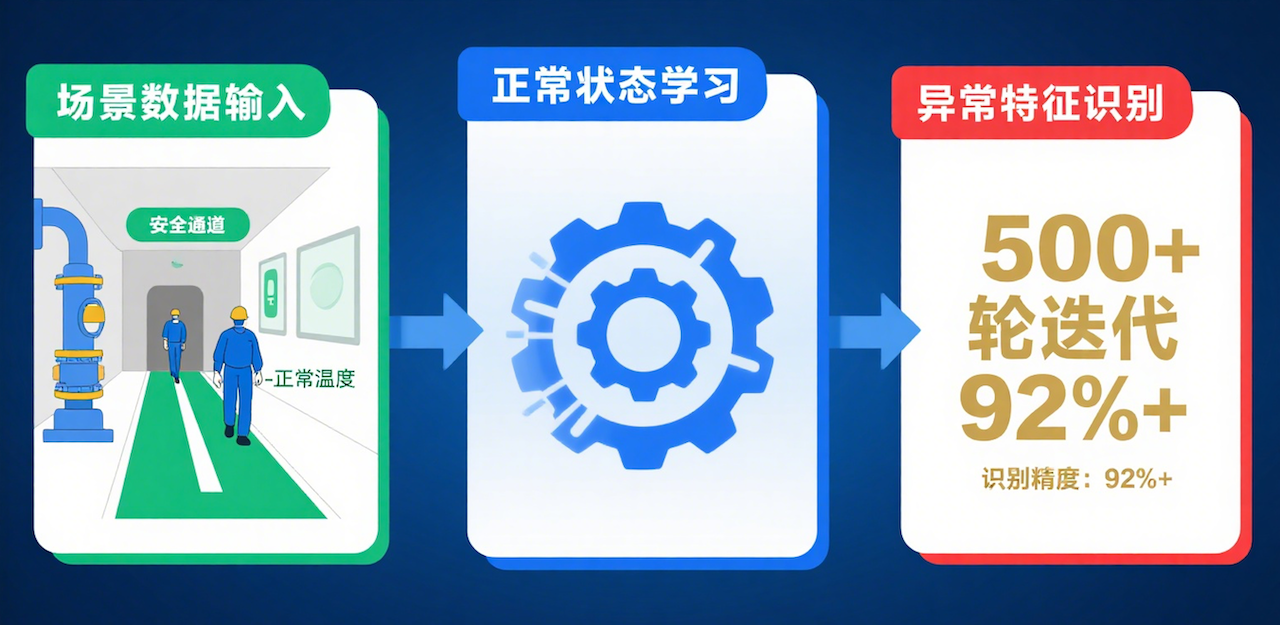 闭环训练优化:将处理后的数据输入本地训练引擎,先让模型学习 “正常状态”(如工人在安全通道行走、泵体正常温度下的外观),再通过对比学习识别 “异常特征”,经过 500 + 轮迭代后,使各类行为的识别精度稳定在 92% 以上。