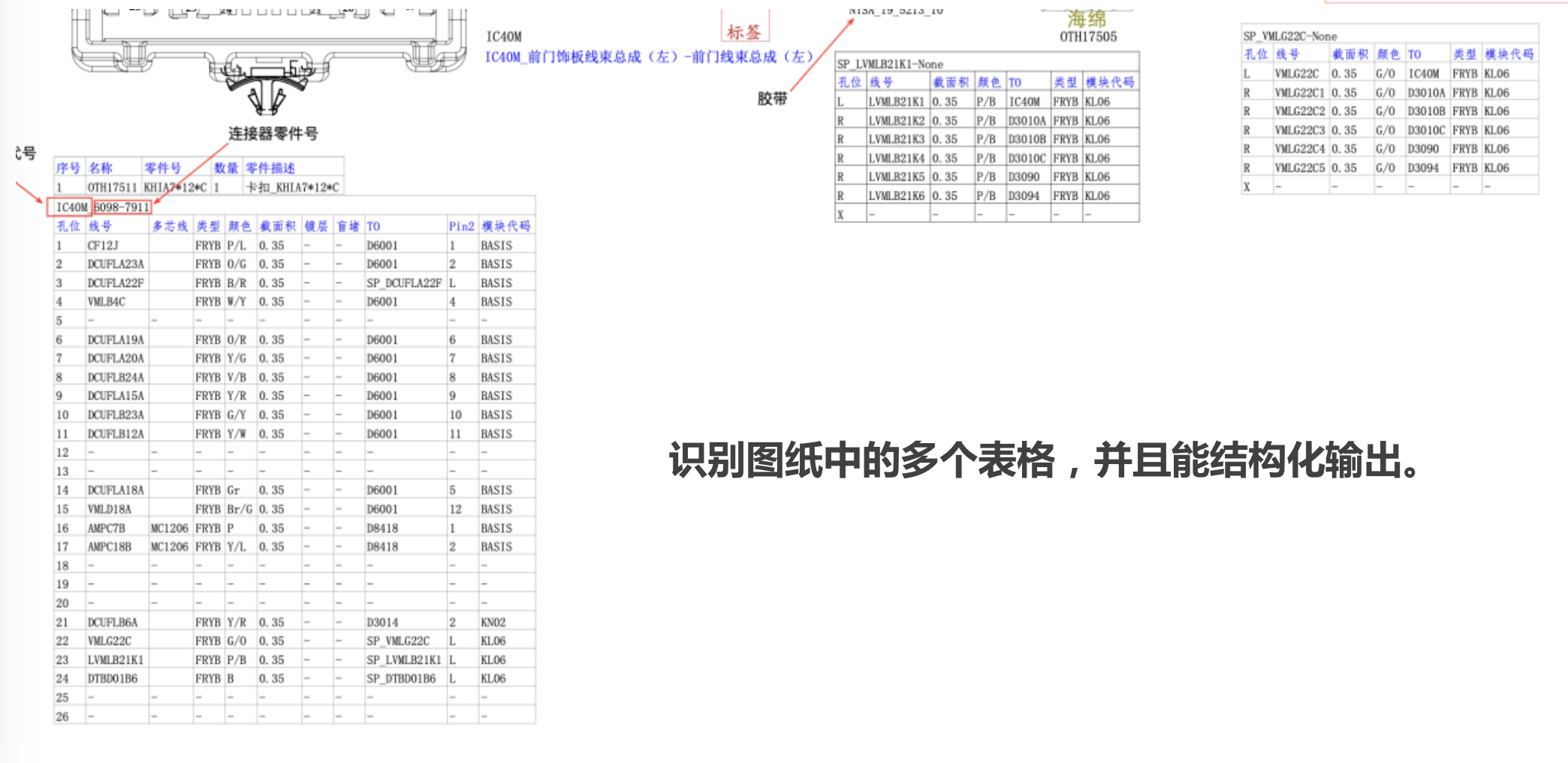 表格识别与结构化输出:具备识别图纸中多个表格的能力,并将其结构化输出,方便后续对表格数据进行分析和利用,为物料用量统计和报价提供了便利。