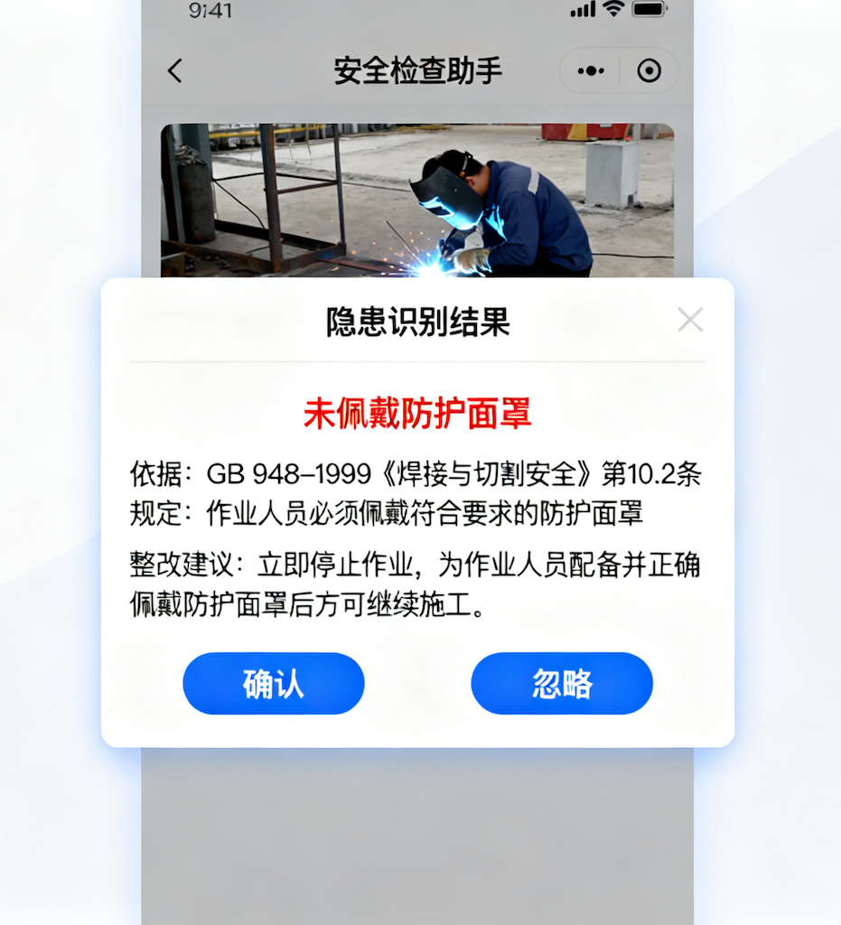 此外,产品支持现场人员通过微信小程序快速完成隐患识图:拍摄动火作业画面、选择 “动火作业” 类别后,AI 立即输出识别结果 —— 包括 “未佩戴护具”“易燃物距离不达标” 等隐患、对应的识别依据(如 “依据 GB 9448-1999,动火点与易燃物最小安全距离应为 10 米”)及整改建议(如 “立即移除动火点 5 米内的油漆桶,作业人员佩戴防护面罩”);同时,管理人员可通过系统管理检查计划、创建检查订单、生成整改报告,实现动火作业安全隐患 “识别 - 告警 - 整改 - 归档” 全闭环管理,让动火作业安全可控、可追溯。