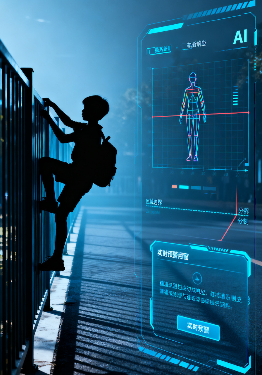 为应对夜间或低光环境,系统集成多传感器融合技术,如红外热成像检测,能在黑暗中捕捉人体热源,预测入侵意图。这不仅仅是简单的“看”,而是“懂”——通过AI算法分析行为模式,区分正常通行与异常入侵,避免误报干扰日常活动。更进一步,系统联动校园APP和安防中心,实现从检测到干预的无缝闭环:一旦异常触发,个性化警示通知会即时推送给相关学生、老师或保安,例如“请立即离开危险区域,注意安全!”这种闭环设计,不仅提升了响应速度,还通过数据积累,形成入侵热力图,帮助学校优化布局。