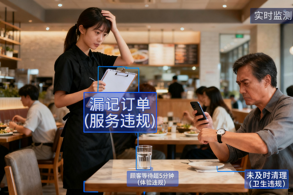 中高端餐饮连锁的痛点痛彻心扉:OSHA数据显示,餐饮违规(如PPE未戴)占行业事故的35%,罚款每月可达7万美元;SOP不规范导致翻台率下降19%,如服务流程混乱引发的顾客等待超5分钟;代打卡率12%,劳动法合规风险高企;督导人力不足,厨房卫生盲区覆盖率仅50%;食材操作不标准,浪费率高达18%,叠加2025年新版食品安全法规,违规罚金翻倍。这些让餐厅从“味蕾天堂”变“风险雷区”。
