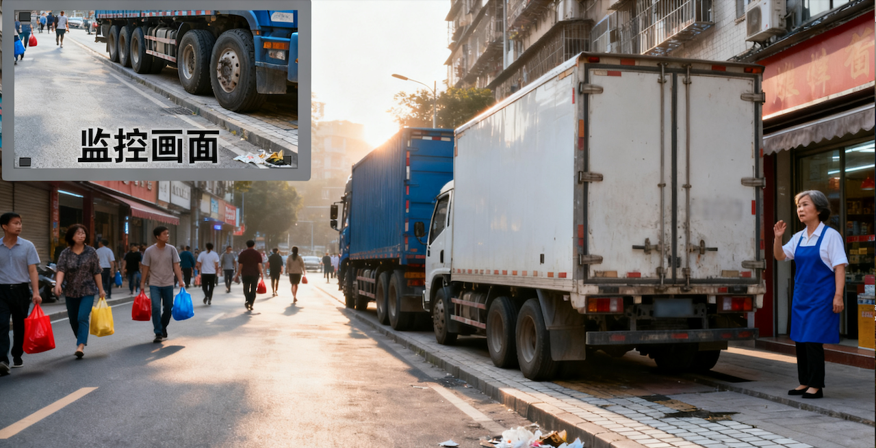 - 早8-10点、晚5-7点送货高峰,大货车、厢式货车长期占用人行道,行人被迫走机动车道;