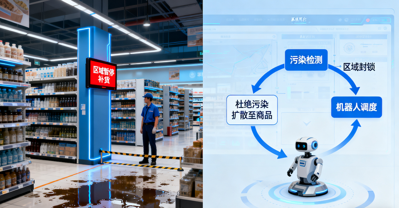 - 如污染区靠近货架,系统自动暂停该区域补货员靠近,杜绝污染扩散至商品。