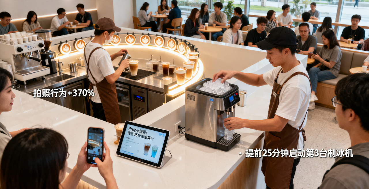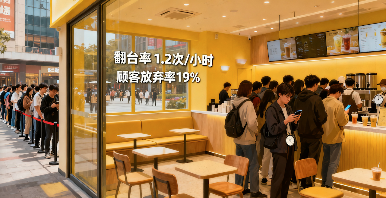 实际场景:城市核心商圈网红奶茶店,营业面积仅32㎡,14个座位,日出杯量常年1000-1300杯,高峰期门口排队却一半座位空着,翻台率长期卡在1.2次/小时左右,顾客放弃率接近20%。传统解决思路停留在“加人、加桌、加设备”,成本与空间都不允许。