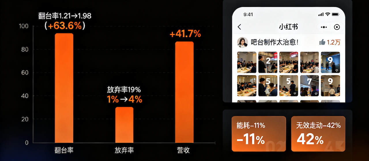 第30天复盘数据:翻台率1.21 → 1.98次/小时(提升63.6%);同店营收增长41.7%;顾客放弃率19% → 4%;低谷期灯光+空调分区自动调光,能耗下降11%;店员日均无效走动减少42%。