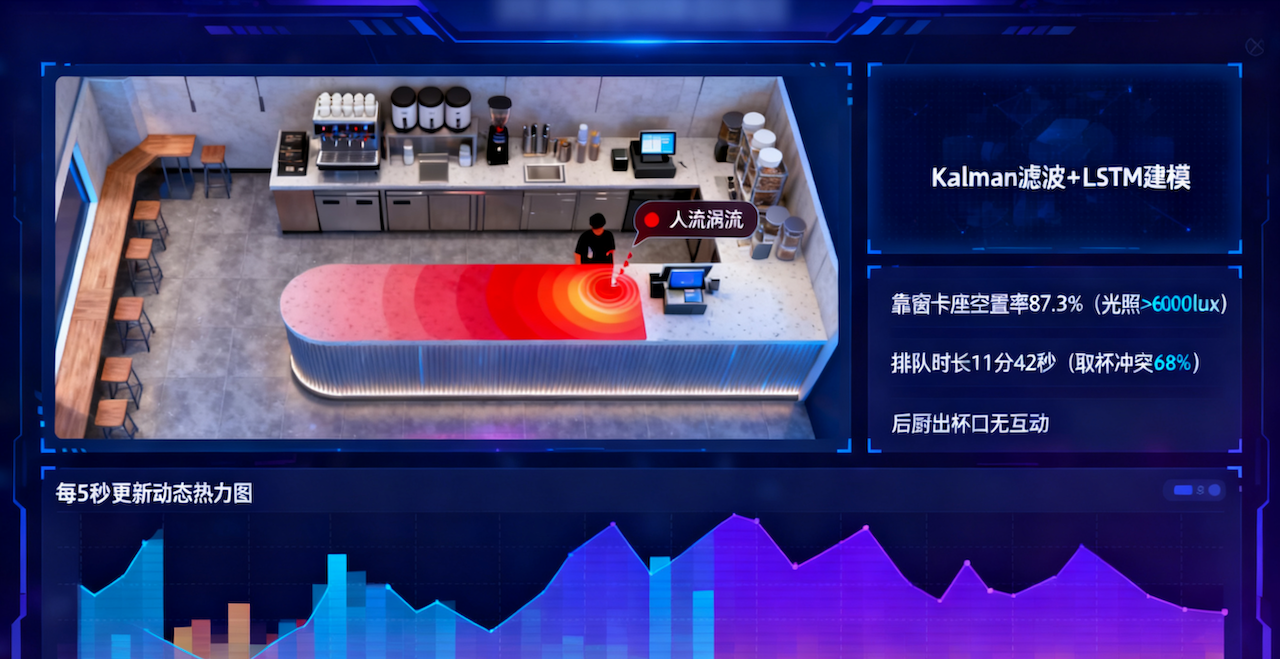 第4天:系统基于Kalman滤波+LSTM时空序列建模,每5秒生成一次全店动态热力图,叠加驻留时长、动线密度、拥堵指数三层数据,自动输出《门店流量诊断报告》: