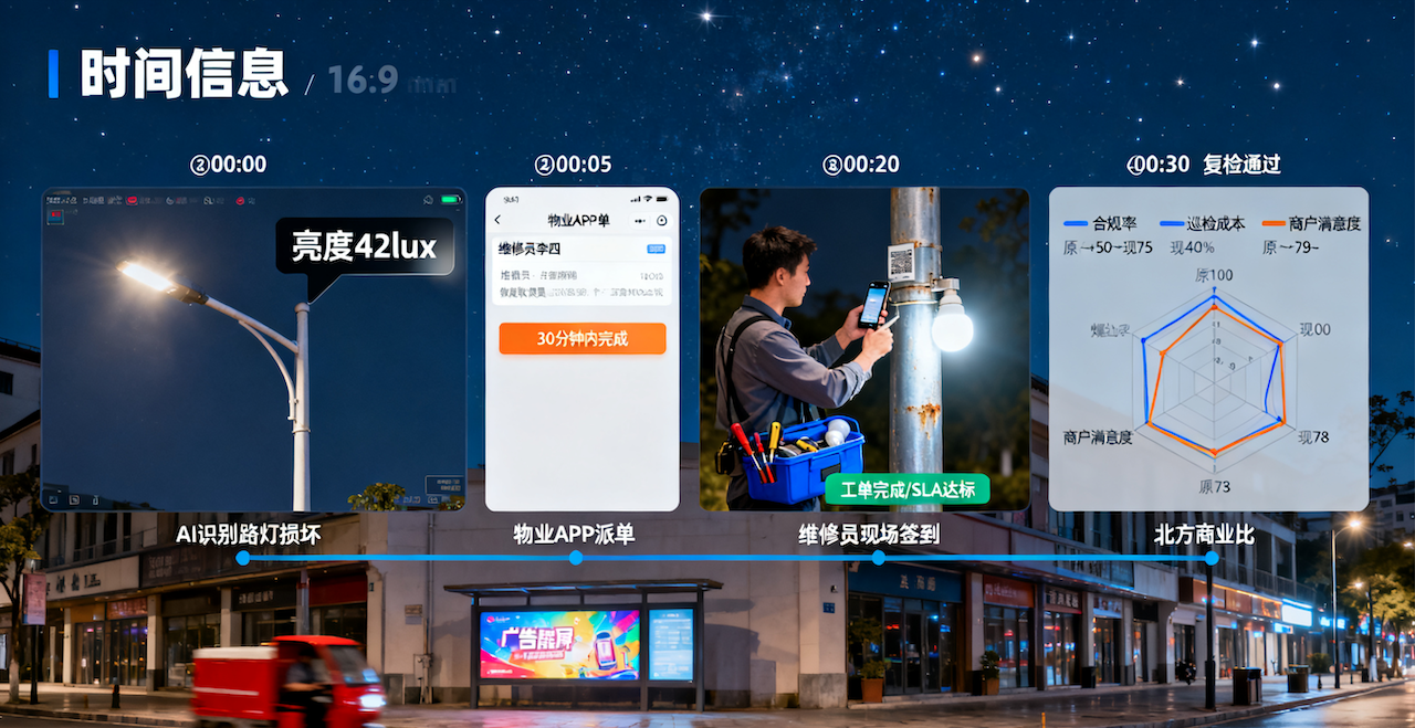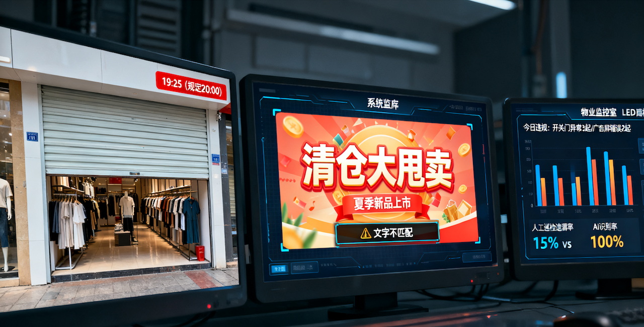 痛点直击:商户开关门不合规、广告屏黑屏/错播、垃圾堆放、摊位占道、地面积水……物业每日巡检200+项,人工遗漏率15%,工单流转平均2.5小时,商户投诉“无人响应”。