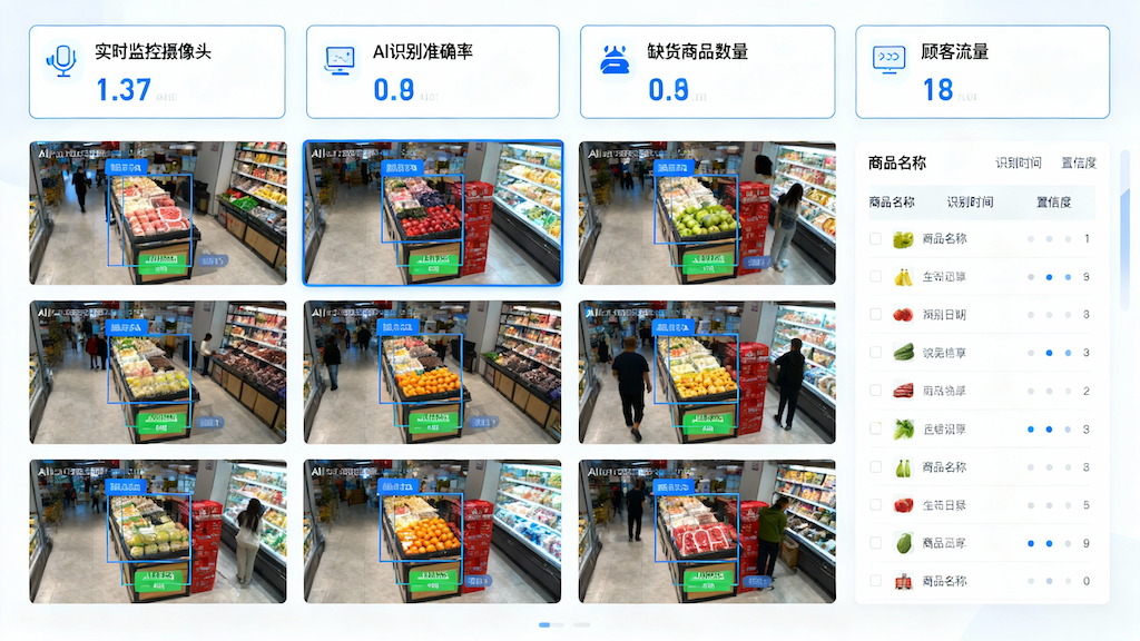 系统重点针对超市内生鲜、零食、日用品三大核心品类,覆盖超过1200种SKU。通过每5分钟一次的自动视觉扫描,系统能够精准识别货架空缺、商品错位、价签不符等多种常见运营问题,将事后处理变为事中及时干预,从根本上杜绝了因断货导致的销售损失。