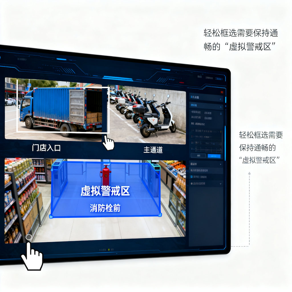 划定区域:你可以在后台管理界面中,轻松框选需要保持通畅的“虚拟警戒区”,如门店入口、主通道、消防栓前等。