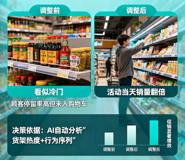一家上海的连锁超市短短三天,就发现了几个重要洞察:“看似冷门”的调味品,其实顾客停留率很高,由于摆放位置太低,被顾客反复摸到却没有进入购物车,调整货架高度后,活动当天销量直接翻倍,促销最终实现了显著增效,而决策依据都来自AI自动分析“货架热度 + 行为序列”。