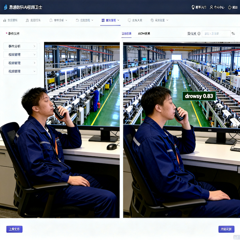 思通数科AI视频卫士利用先进的人体行为识别技术,能够对员工的工作状态进行无感化、毫秒级的AI检测。它主要识别以下关键异常行为:
