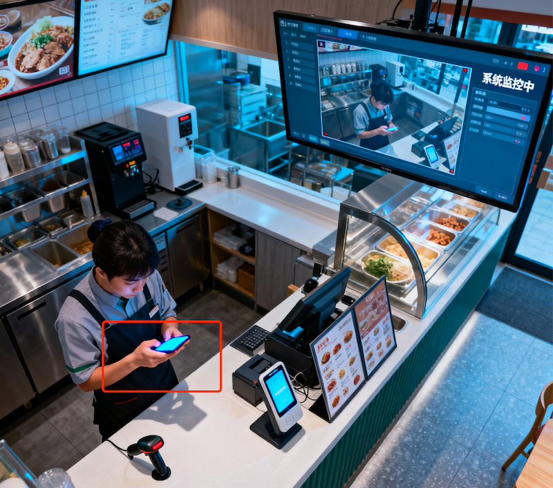 案例介绍: 一家大型连锁餐饮门店在部署了AI视频卫士的员工行为监管模块后,发现服务高峰期(中午12点至1点)后,服务台员工的“手机使用”和“离岗”警报数量显著增加。