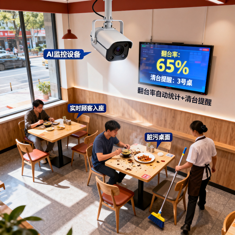 - 翻台率优化: 实时顾客入座人数识别 + 翻台率自动统计,并结合桌面状态(空闲/脏污)自动识别,提醒清台,能直接提高翻台效率和年利润率。